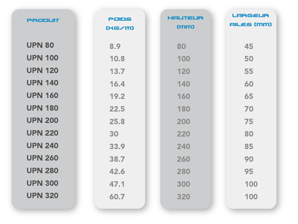 Profil UNP Qualité : S235JR S235JO S235J2 S275JR S275JO S275J2 S355JR S355JO S355J2+N S355K2 S355G1 S355G4 S355G11 S355G12 S355JOW S355J2W 16Mo3 S355ML s460M Norme : EN10279:2000 Coupe Droite | Coupe Biaisé | Perçage | Gruegage | Marquage Sur demande : Brut | Galvanisé à chaud par trempage selon EN ISO 1461 | Grenaillé SA 2.5 + prépeinture (Rouge ou Gris) UPN 80 | UPN 100 | UPN 120 | UPN 140 | UPN 160 | UPN 180 | UPN 200 | UPN 220 | UPN 240 | UPN 260 | UPN 280 | UPN 300 | UPN 320 | UPN 350 | UPN 380 | UPN 400 Envoyer un mail Appeler le fourniseur